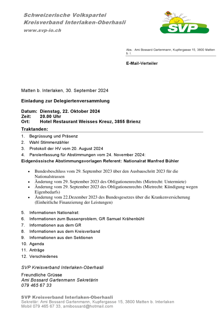 Delegiertenversammlung Weisses Kreuz Brienz 22.10.24 um 20 Uhr
