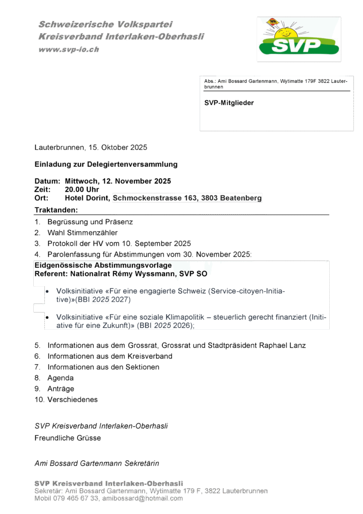 Delegiertenversammlung Mittwoch, 12. November 2025 Hotel Dorint, 3803 Beatenberg